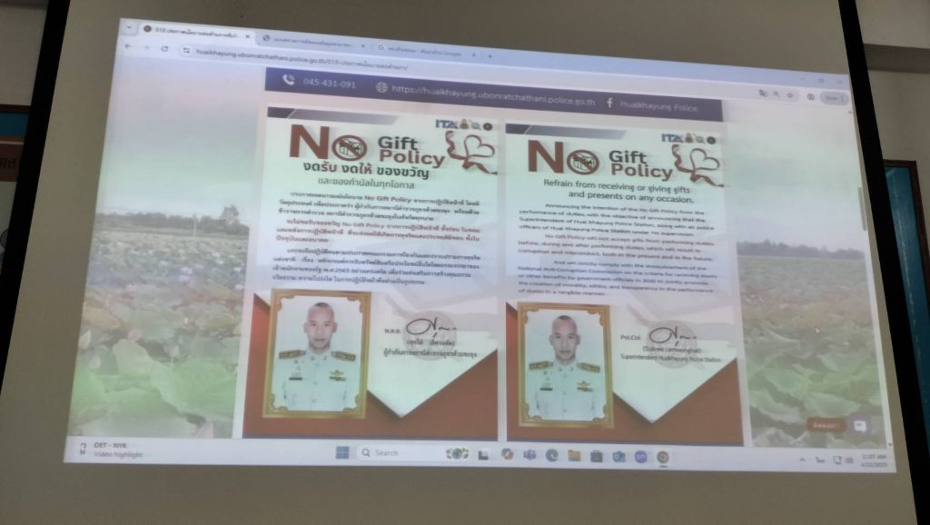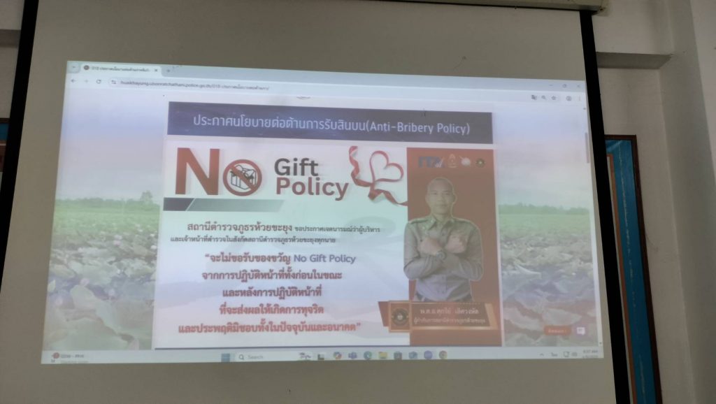 ประกาศนโยบายต่อต้านการรับสินบน Anti Bribery Policy 23 เมษายน 2568 โดย admin / O1 โครงสร้าง และอำนาจหน้าที่ วันที่ 16 มีนาคม 2568 เวลา 10.00 น. พ.ต.อ.ศุกรีย์ เลิศวงหัด ผกก.สภ.ห้วยขะยุง จัดประชุมบริหาร สภ. ประจำเดือน มีนาคม 2568 โดยมีข้าราชการตำรวจในสังกัดเข้าประชุม จำนวน 46 นาย มีวาระสำคัญ ดังนี้– ถ่ายทอดนโยบาย/ข้อสั่งการผู้บังคับบัญชาระดับ ตร., ภ.3 และ ภ.จว.อุบลราชธานี– ติดตามการดำเนินงานการประเมินคุณธรรมและความโปร่งใสในการดำเนินงานหน่วยงานภาครัฐ Integrity and Transperency Assessment : ITA ประจำปี 2568– การประกาศนโยบายต่อต้านการรับสินบน Anti Bribery Policy และการไม่รับของขวัญของกำนัล No Gift Policy ตามประกาศสถานีตำรวจภูธรห้วยขะยุง ลงวันที่ 15 มีนาคม 2568 เพื่อให้ข้าราชการตำรวจในสังกัดให้นำไปปฏิบัติให้บังเกิดผลเป็นรูปธรรม FacebookFacebookXXLINELine