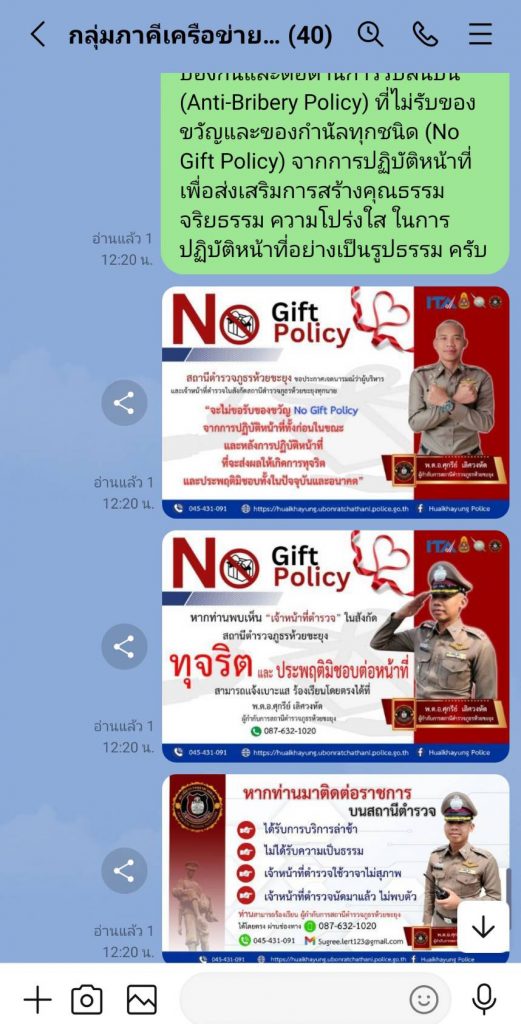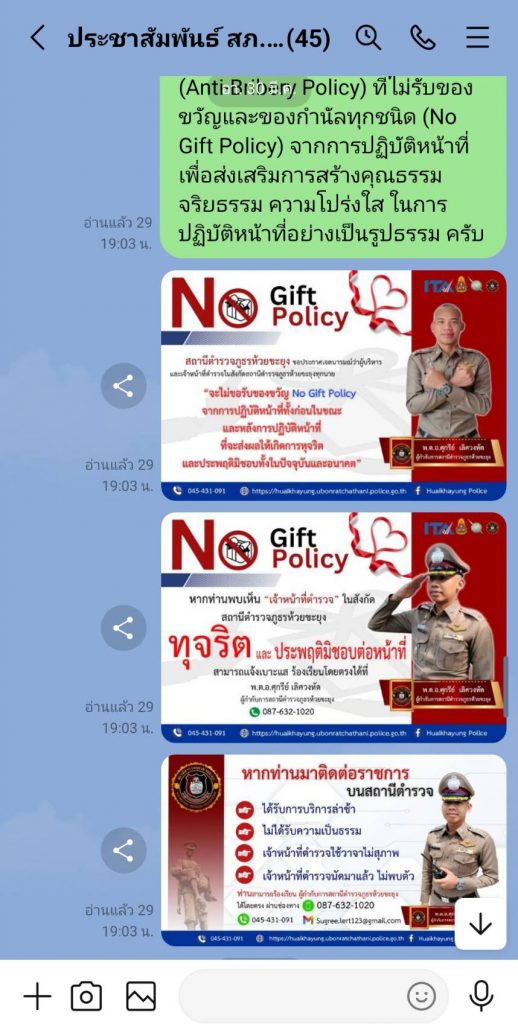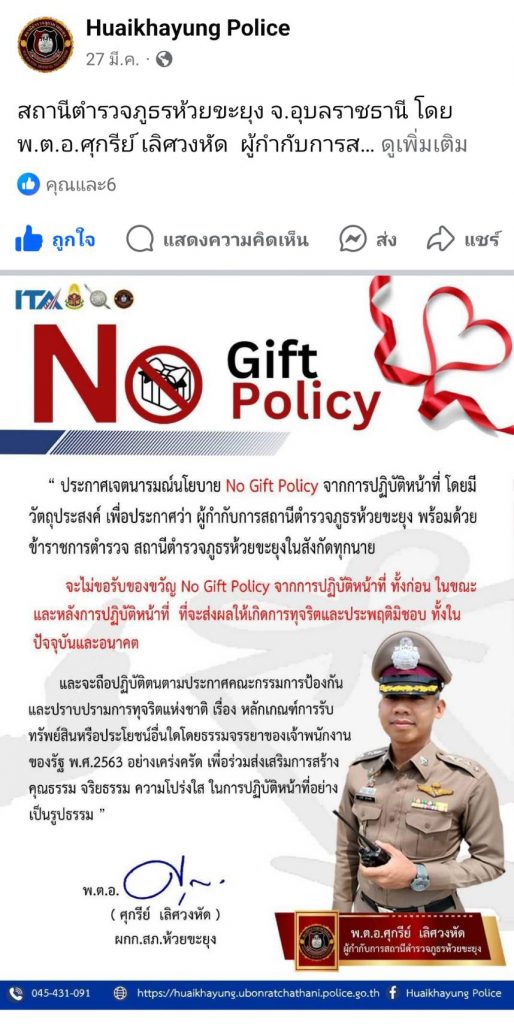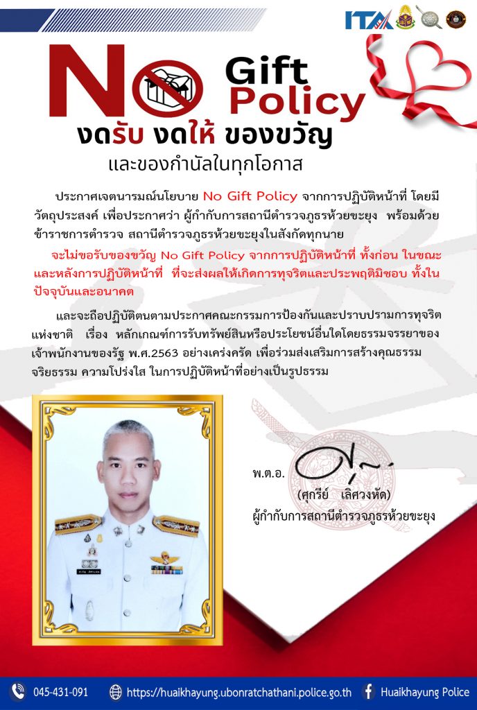 สถานีตำรวจภูธรห้วยขะยุง โดย พันตำรวจเอก ศุกรีย์ เลิศวงหัด ผู้กำกับการ สถานีตำรวจภูธรห้วยขะยุง ประกาศนโยบาย ไม่รับของขวัญและของกำนัลทุกชนิด (No Gift Policy) จากการปฏิบัติหน้าที่ และ นโยบายต่อต้านการรับสินบน (Anti-Bribery Policy) ลงวันที่ 15 มีนาคม 2568