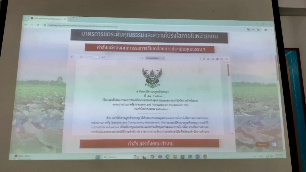 วันที่ 25 มีนาคม 2568 เวลา 10.00 น. พ.ต.ท.หญิง ภัชธณิชา มาลีหวล สว.อก.สภ.ห้วยขะยุง พร้อมด้วย ร.ต.อ.ทิวารกร ยุบล รอง สว.ธร.สภ.ห้วยขะยุง ประชุมชี้เเจงและแนะนำแนวทางการดำเนินงานการประเมินคุณธรรมและความโปร่งใสฯ (O20) ให้แก่เจ้าหน้าที่ผู้รับผิดชอบแต่ละสายงานสายงานต้องสามารถระบุกระบวนการดำเนินงานที่มีความเสี่ยง เพื่อนำไปจัดทำข้อมูลในส่วนที่เกี่ยวข้อง ณ ห้องประชุม ศปก.สภ.ห้วยขะยุง