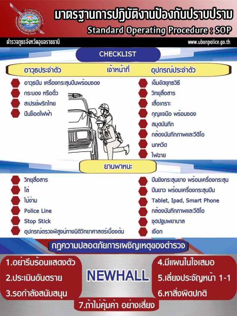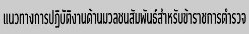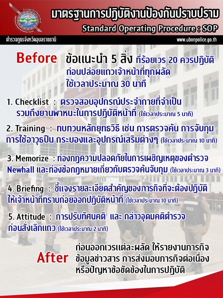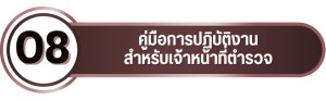 ข้อมูลเกี่ยวกับคู่มือหรือมาตรฐานการปฏิบัติงาน ตามภารกิจของแต่ละงาน (งานอำนวยการ , งานป้องกันปราบปราม , งานจราจร , งานสืบสวน และ งานสอบสวน) พร้อมรายละเอียด